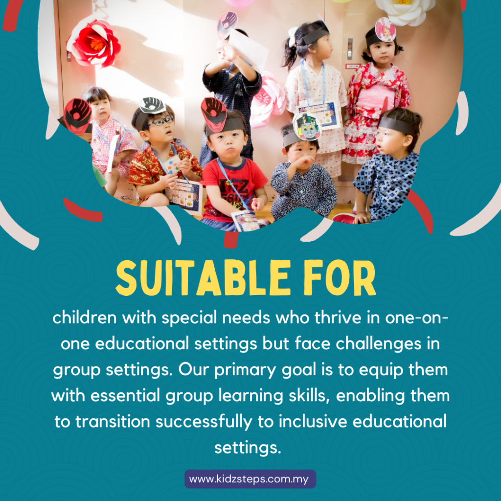 This program is suitable for children who thrive in one-on-one learning environments but face challenges when in group learning environment. These challenges often manifest as an inability to remain seated, difficulties in sustaining attention, struggles with group instructions and rules, challenges in self-control, always need one-to-one reminds or assistance from teacher, and difficulties in independently following schedules.